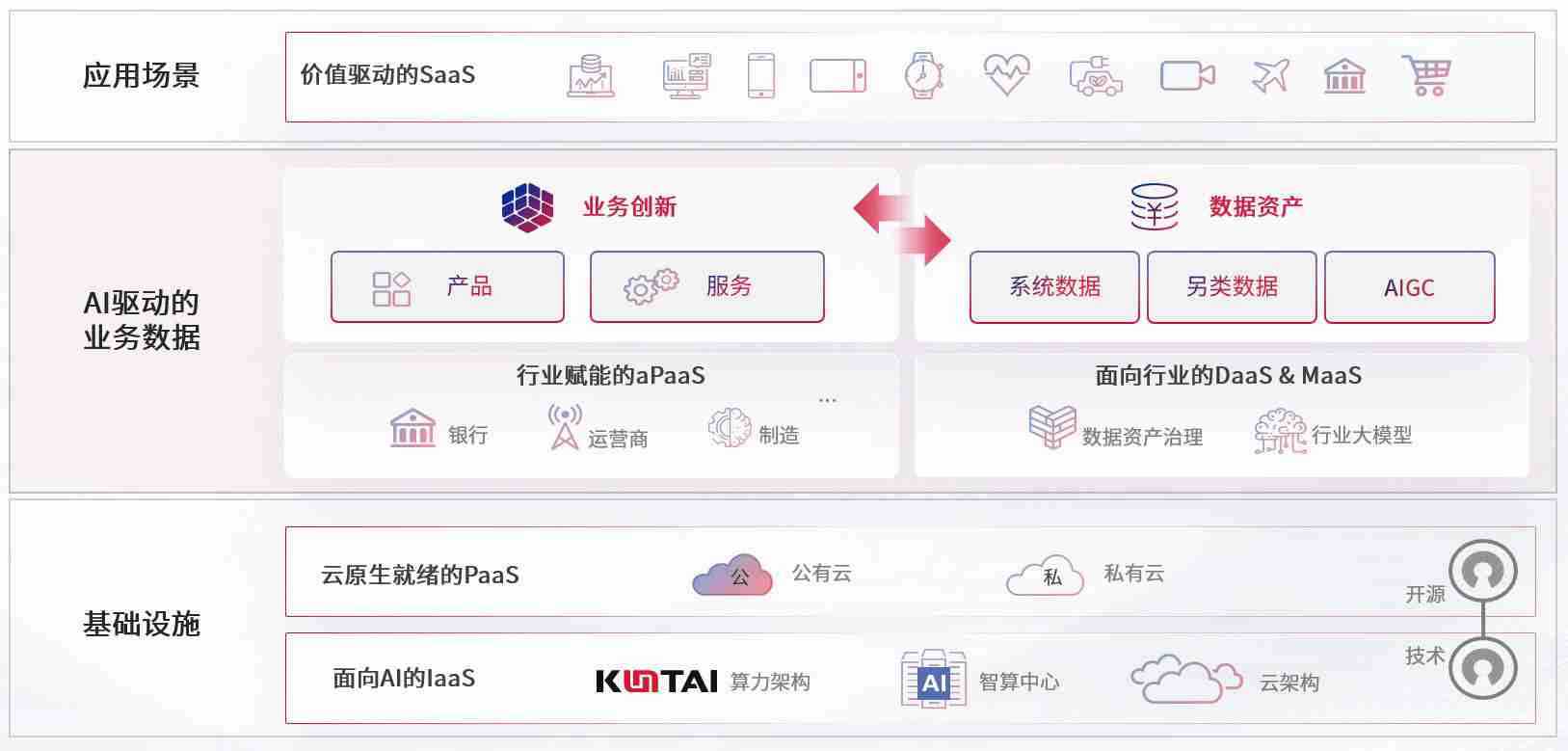 数字时代,,,,围绕企业数字化转型的关键要素,,,Z6尊龙数码开创性的提出数云融合战略和技术体系框架,,,,着力在云原生、、数字原生、、AI原生和信创产业上架构产品和服务能力,,,,为处在不同数字化转型阶段的快消零售、、汽车、、、金融、、、医疗、、政企、、教育、、、运营商等行业客户提供泛在的敏捷IT能力和融合的数据驱动能力,,,,构建跨界融合创新的数字业务场景和新业务模式,,,,助力企业级客户建立面向未来的核心能力和竞争优势,,全面推动社会的数字化、、、、智能化转型升级。。